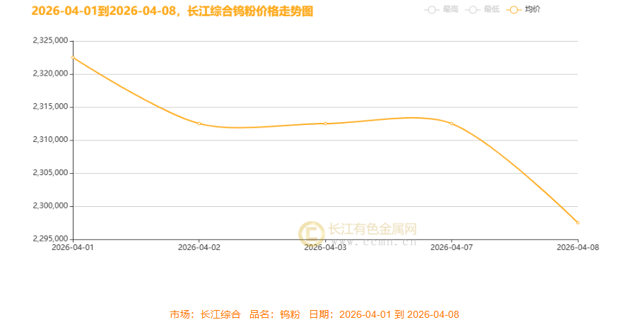 本周(4月1日至8日),长江综合市场钨粉价格呈现震荡阴跌走势,市场情绪偏弱。价格自周初(4月1日)的232.25万元/吨持续下滑,至4月8日已回落至229.75万元/吨,期间累计下跌幅度约为0.34%。