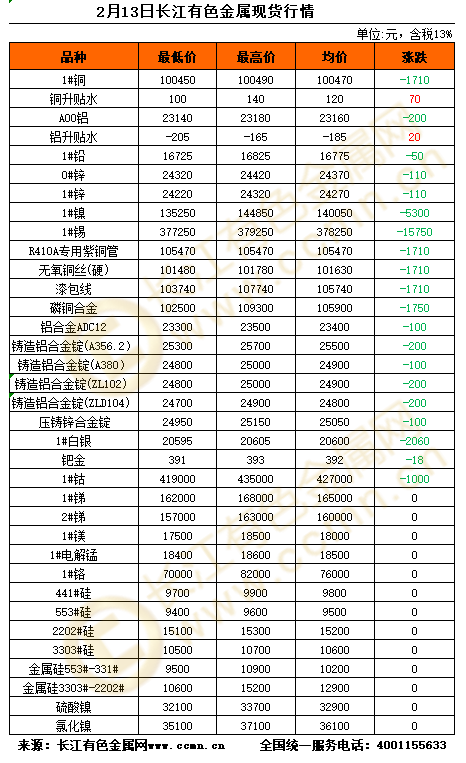 2月13日长江有色金属现货行情